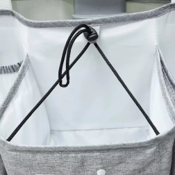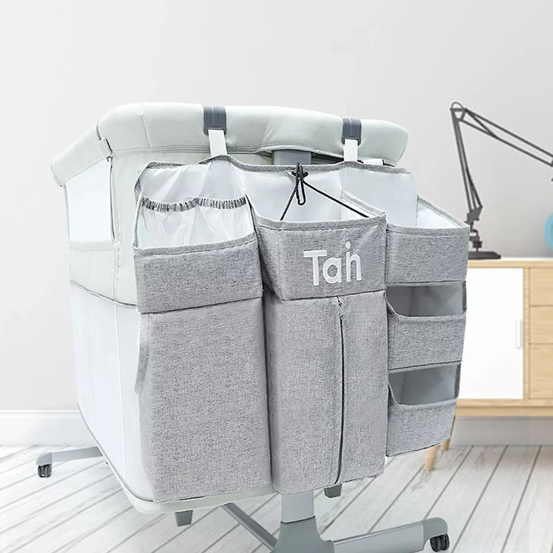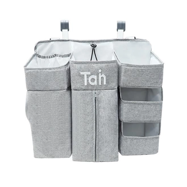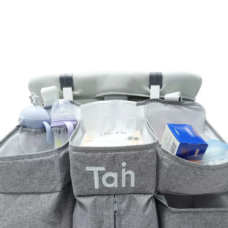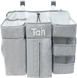 Praktický sivý organizér na detskú postieľku udrží všetky potreby pre bábätko prehľadne po ruke. Ponúka viac vreciek, police a uzatvárateľné vrecko na zips na plienky, sieťované vrecká na drobnosti a univerzálne uchytenie na postieľku, prebaľovací pult, dvere či do skrine.
