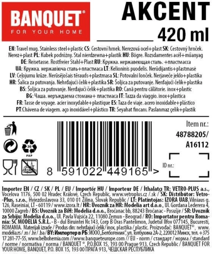 Užite si svoj obľúbený nápoj kdekoľvek s termohrnčekom AKCENT s objemom 420 ml. Kombinuje odolnú vonkajšiu časť z nerezu 201, vnútornú vložku z kvalitnej nehrdzavejúcej ocele 304 a protišmykový silikónový rukáv. Vďaka dvojstennému prevedeniu pomáha lepšie udržať požadovanú teplotu nápoja a zároveň je príjemný do ruky.
