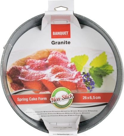Granitová forma na tortu s priemerom 26 cm, výška 6,5 cm, hrúbka steny 0,4 mm. Plechy a formy na pečenie s nepriľnavým povrchom sú nepostrádateľným pomocníkom v každej kuchyni. Nepriľnavý povlak XYNFLON je na báze PTFE (polytetrafluóretylén), je veľmi odolný, má prvotriedne nepriľnavé vlastnosti a ľahko sa udržiava.