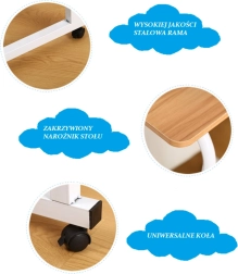 Stôl je umiestnený na špeciálne navrhnutom ráme, ktorý vám umožní pohodlné používanie aj v posteli. Štyri kolieska na základni umožňujú rýchle a bezpečné presúvanie celku. Ak chcete kolieska na stole zablokovať, stačí stlačiť zámok. Podnožky možno veľmi rýchlo vybrať. Stôl je ideálny na použitie v obývacej izbe, spálni alebo kuchyni. Veľkou výhodou nášho stola je nastaviteľná výška, takže si ho môžete prispôsobiť podľa svojich predstáv. Stôl má nastaviteľnú výšku 70-90 cm. Ďalšou výhodou je univerzálne a veľmi štýlové farebné prevedenie.