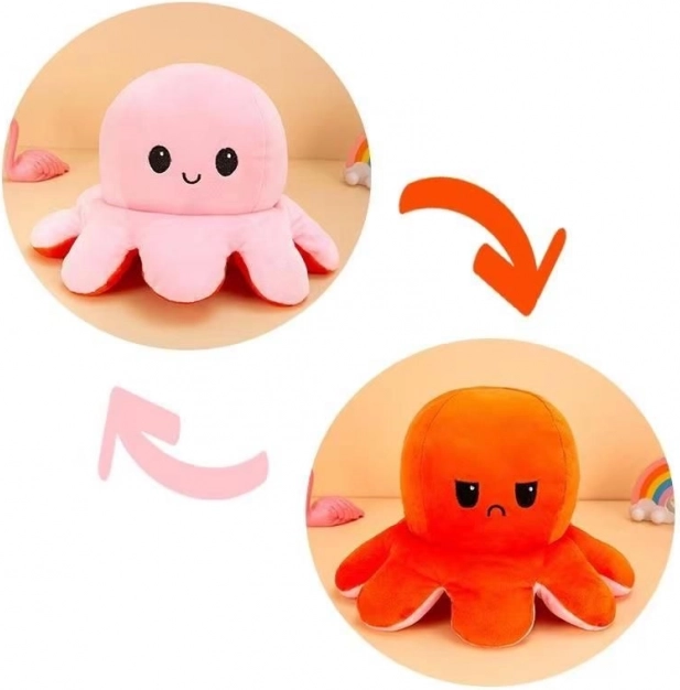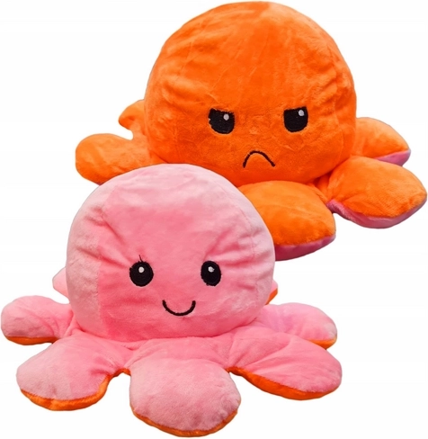Táto obojstranná plyšová chobotnička je dokonalým spoločníkom pre deti aj dospelých. Jednoduchým otočením počas chvíľky prepnete výraz z usmiateho na smutný či nahnevaný a zároveň zmeníte farbu z ružovej na oranžovú. Mäkučký materiál láka k mojkaniu a skvele sa hodí aj ako antistresová hračka.