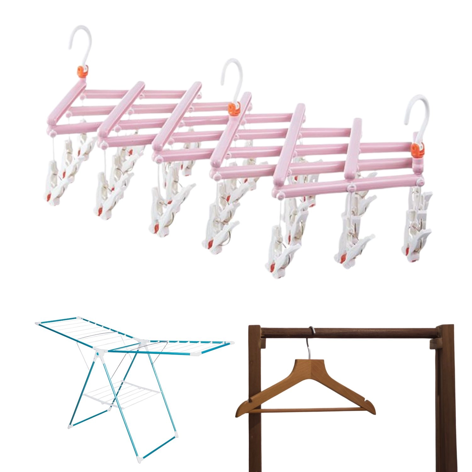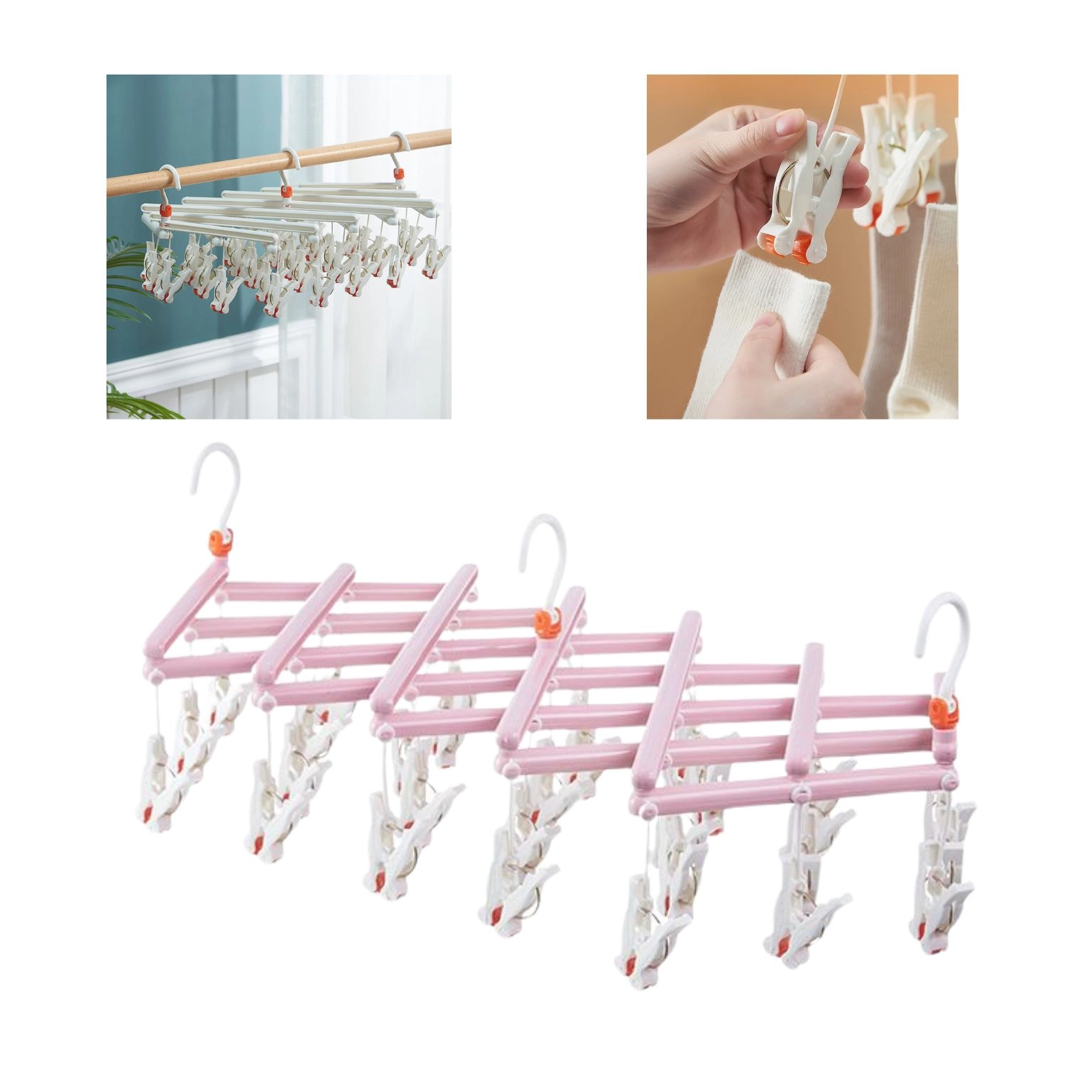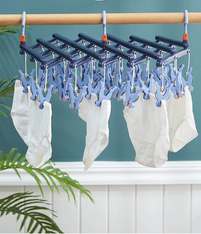 Praktický skladací sušiak s 29 klipsami a otočným háčikom je ideálny na ponožky, spodnú bielizeň a detské oblečenie. Ľahká a odolná plastová konštrukcia šetrí miesto, ľahko sa prenáša a hodí sa na vnútorné aj vonkajšie sušenie.