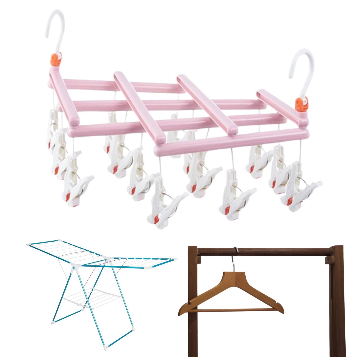 Udržte poriadok pri sušení bielizne a využite každý centimeter priestoru. Tento ružový sušiak s 14 pevnými kolíčkami ponúka rýchle a prehľadné zavesenie menších kusov bielizne. Otočný hák umožní ľahké zavesenie na tyč, šnúru, balkón či sušiak a skladací dizajn uľahčí skladovanie aj prenášanie.