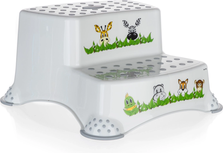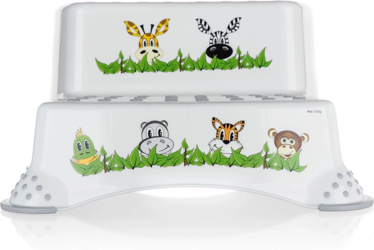 Praktické detské dvojstupňové schodíky BANQUET Jungle pomôžu deťom bezpečne dosiahnuť k umývadlu, na toaletu či do vyšších políc. Ľahká plastová konštrukcia s protišmykovými bodmi na stupňoch aj nožičkách zaisťuje stabilitu, hravý zvierací motív motivuje k samostatnosti. Nosnosť 120 kg potvrdzuje pevnosť a odolnosť na každodenné používanie.