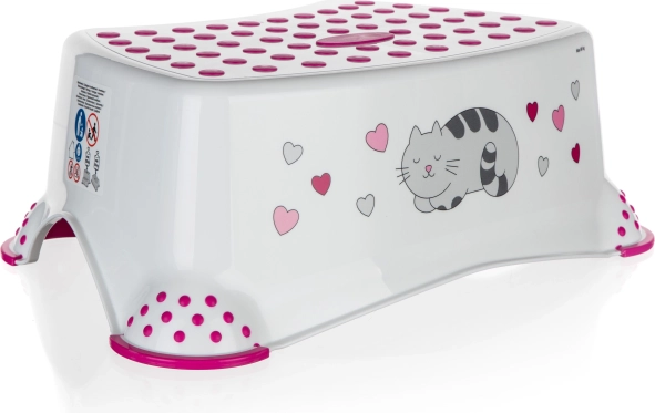 Doprajte deťom väčšiu samostatnosť v kúpeľni aj v kuchyni. Detské stupátko s motívom mačičky ponúka bezpečný krok navyše, keď je potrebné dosiahnuť vyššie. Protišmykové body na hornej ploche a gumové zakončenie nožičiek minimalizujú riziko pošmyknutia.