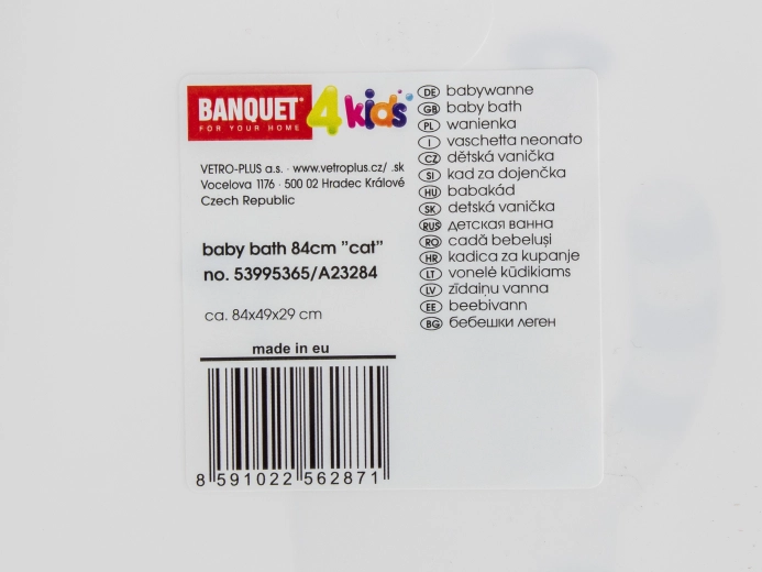 Praktická detská vanička s dĺžkou 84 cm v elegantnej bielej farbe s roztomilým dekorom mačky. Ponúka ergonomický tvar pre pohodlné a bezpečné kúpanie od narodenia, ľahkú manipuláciu a jednoduché čistenie. Integrované odkladacie priehlbiny umožnia mať hubku, mydlo či hračky vždy poruke. Nosnosť až 25 kg.
