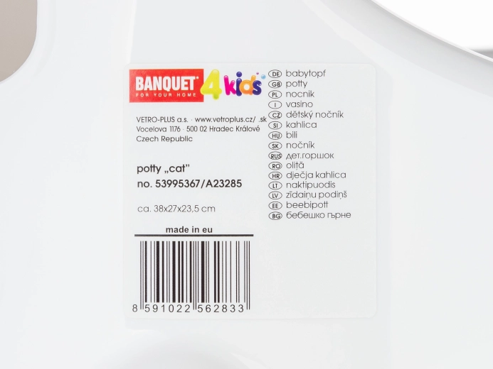 Praktický detský nočník s motívom mačičky od značky BANQUET ponúka maximálnu stabilitu vďaka protisklzovým nožičkám, anatomický tvar s vysokým operadlom pre pohodlné sedenie a ľahké čistenie vďaka hladkému povrchu. Zvýšená stredová časť pomáha zabrániť vyšplechnutiu obsahu.