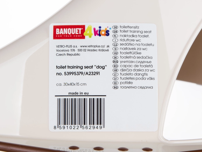 Detská WC redukcia BANQUET DOG je ideálna pomôcka pre deti, ktoré prechádzajú z nočníka na bežnú toaletu. Zmenšená kópia klasickej dosky vytvára pohodlné a isté sedenie, zatiaľ čo protisklzové prvky po obvode bránia pohybu sedátka aj nechcenému pošmyknutiu.