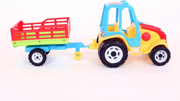 Detský traktor s prívesom ponúka zábavnú hru doma aj vonku. Príves je na jednej náprave, je otočný a nakláňa sa dozadu pre jednoduché vykládanie. Hračka je vyrobená z bezpečných materiálov bez ťažkých kovov a spĺňa všetky bezpečnostné podmienky. Rozmery hračky: dĺžka 48 cm, šírka 15 cm, výška 17,5 cm.