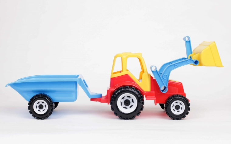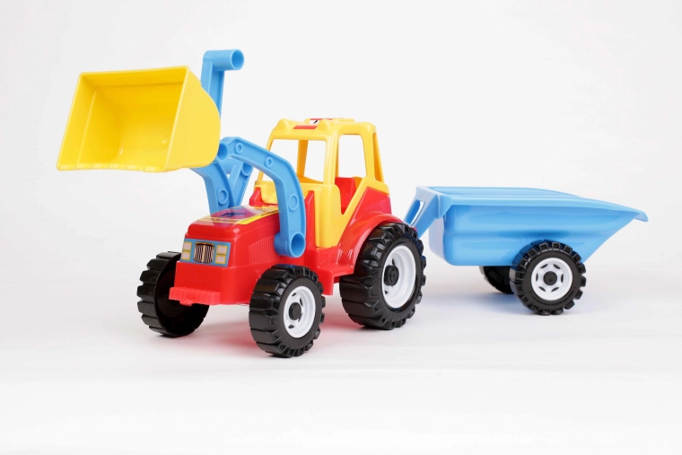 Traktor s čelným nakladačom s možnosťou zdvíhania lyžice nahor spoločne s naloženým pieskom. Farebný plastový traktor je vzadu vybavený pripojeným dvojkolesovým prívesom, ktorý pripomína veľké fúriky. Vďaka dvojkolesovej náprave sa príves po odpojení ľahko sklopí dozadu, čo umožňuje vysypanie obsahu. Traktor je navyše ozdobený zaujímavými samolepkami imitujúcimi svetlá.