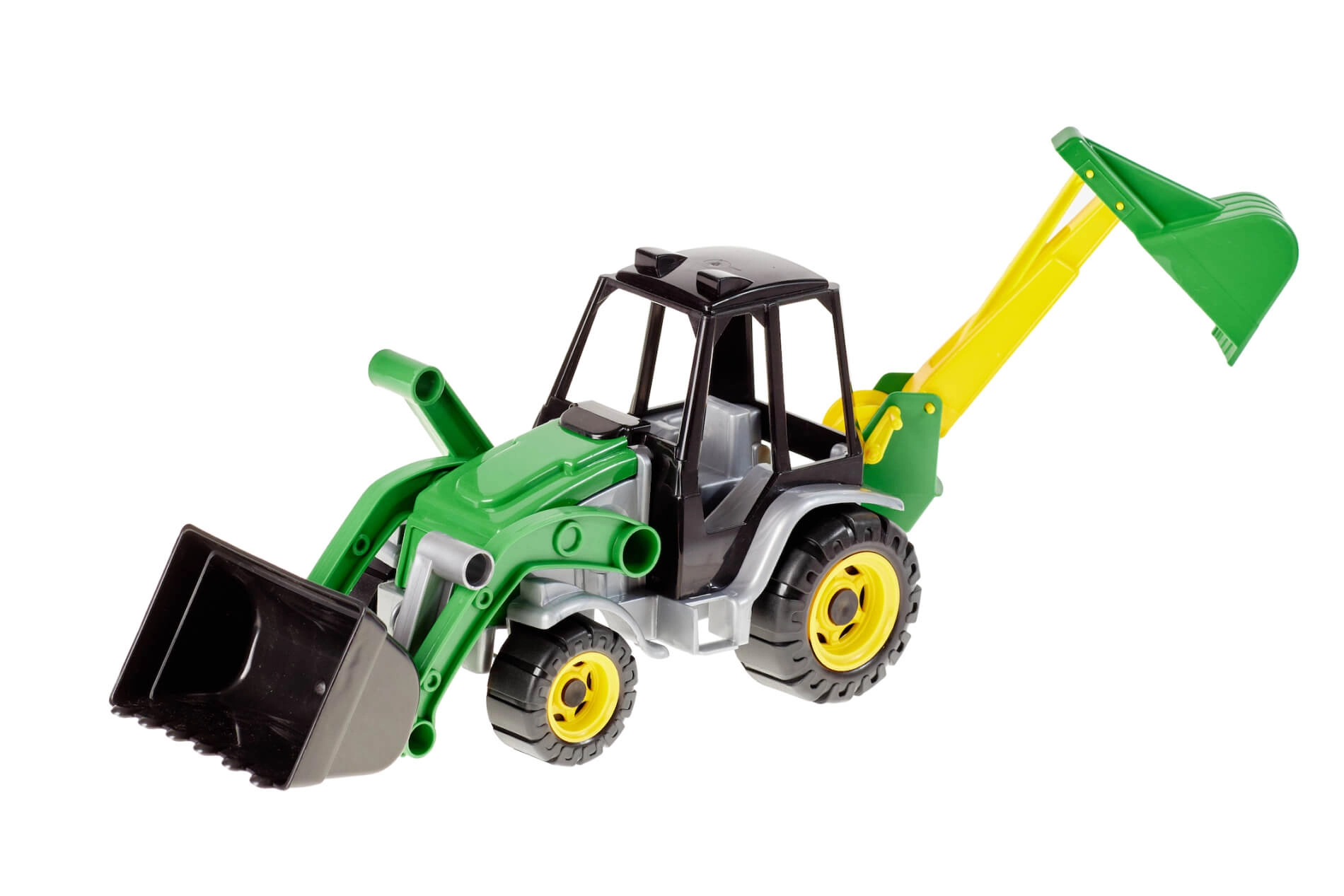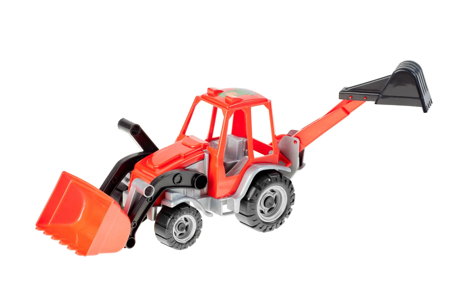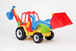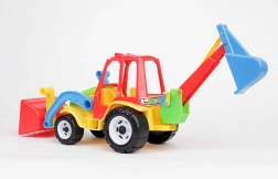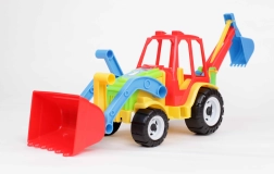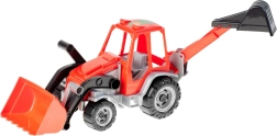 Tento dvojfunkčný traktor s bagrom ponúka deťom realistickú stavebnú zábavu. Vďaka pohyblivej prednej lopate a zadnej bagrovacej lyžici môžu prenášať, nakladať a hĺbiť imaginárny materiál. Odolná konštrukcia je vhodná na hranie v interiéri aj vonku.