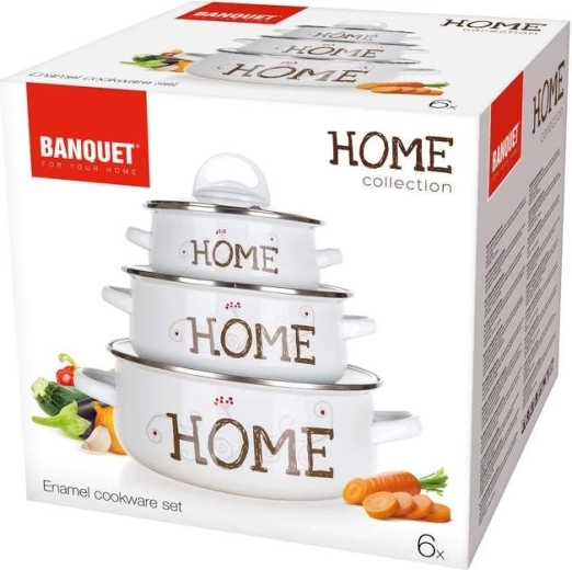 Sada BANQUET Home prináša spoľahlivé hrnce pre každú kuchyňu – ľahké, odolné a jednoducho udržiavateľné. Nadčasový biely dizajn s nápisom HOME sa hodí do moderných aj tradičných interiérov, sklenené pokrievky s plastovým knobom umožňujú kontrolu pokrmov bez zbytočného zdvíhania veka.