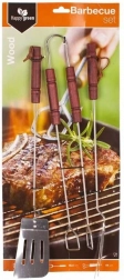 Trojdielna sada grilovacieho náradia obsahuje kliešte, obracačku a vidličku z chrómovanej ocele. Rukoväť je vyrobená z dreva. Sada obsahuje základné náradie potrebné na grilovanie. Náradie je vybavené závesným očkom.
