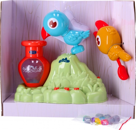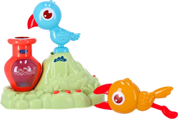 Hračka navyše obsahuje vtáčiu mamičku, ktorá prináša dieťaťu kamienky. Batoľa si môže precvičovať manuálne zručnosti tým, že tieto kamienky vloží do džbánika. Na vybratie kamienkov z hračky stačí použiť okienko na zadnej strane.
