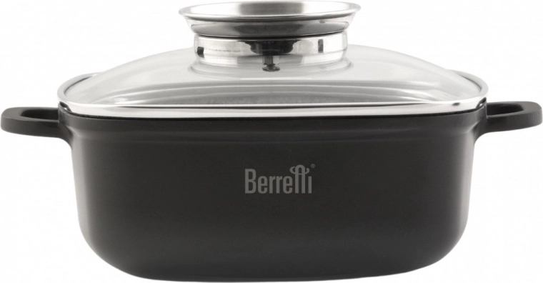 Štvorcový hrniec s pokrievkou BERRETTI z liateho hliníka s granitovým nepriľnavým povrchom je ideálny na zdravé varenie, pečenie aj dusenie. Sklenená pokrievka s otvorom na paru uľahčuje kontrolu prípravy, rovnomerná distribúcia tepla šetrí energiu a kompatibilita so všetkými typmi sporákov vrátane indukcie prináša maximálnu univerzálnosť.