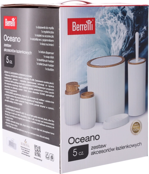 Elegantná 5-dielna sada kúpeľňových doplnkov BERRETTI v kombinácii bielej a dreva prináša do kúpeľne čistý vzhľad aj praktické usporiadanie. Obsahuje pohárik na zubné kefky, dávkovač mydla, mydelničku, odpadkový kôš a WC kefu. Vďaka hladkým povrchom sa ľahko čistí a odolný materiál PS a ABS zaručuje dlhú životnosť a pohodlné každodenné používanie.