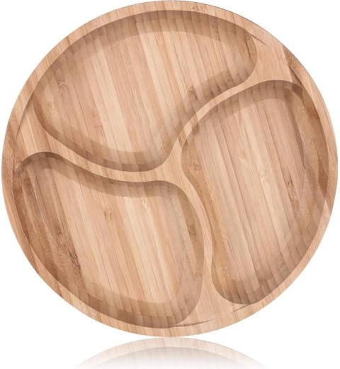 Elegantná delená miska z prírodného bambusového dreva s priemerom 25 cm a výškou 4 cm je ideálna na servírovanie snackov, orechov, syrov či dipov. Vďaka trom oddeleným priehradkám udržíte chute aj textúry oddelene a stôl bude vždy pôsobiť upravene. Prírodný bambus, praktické rozdelenie a jednoduchá údržba z nej robia štýlový a funkčný doplnok na každodenné používanie aj hostiny.