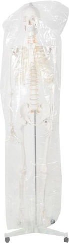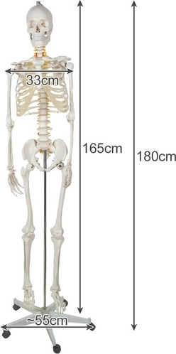 Model kostry má výšku 165 cm samotný a 180 cm s pripojeným stojanom, čo predstavuje realistickú veľkosť dospelého človeka.