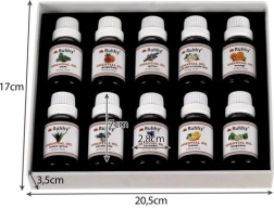 Celý set obsahuje 10 rôznych vôní ako eukalyptus, pomaranč, mäta, levanduľa a ďalšie. Každá fľaštička má objem 15 ml.