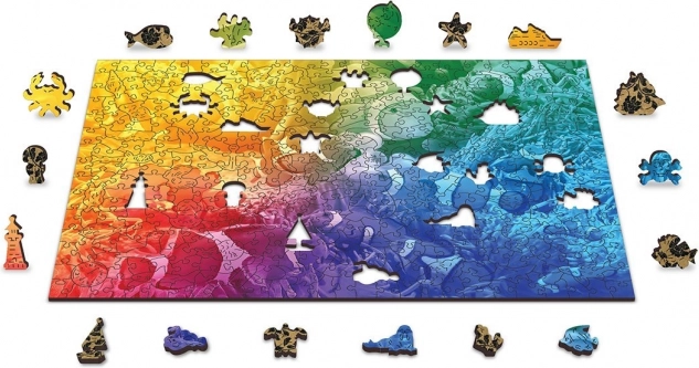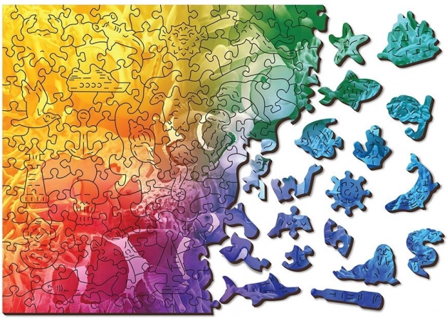 Zažite pestrý podmorský svet s motívom tropických rýb a zábavou, ktorá len tak neomrzí. Vďaka laserom vyrezávaným dielikom a desiatkam originálnych tvarov vás čaká chytľavá výzva. Puzzle je obojstranné – z líca skladáte farebný motív, z rubu opakujúci sa vzor podľa tvarov.
