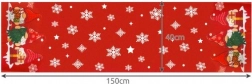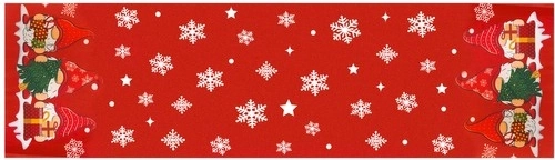 Červený podklad s bielymi vločkami a hviezdami, na koncoch dekor škriatkov s darčekmi – perfektný doplnok vianočného prestierania.