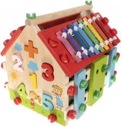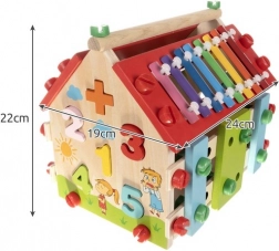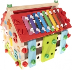Drevený domček pre deti je multifunkčná a edukatívna hračka navrhnutá na rozvoj motorických a kognitívnych schopností detí. Obsahuje rôzne aktivity, vrátane xylofónu a vkladania tvarov, ktoré zaručujú skvelú zábavu.