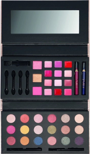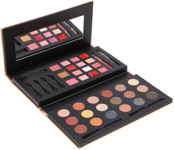 Rozkladacia kozmetická paletka „Glam To Go“ – v dvoch poschodiach obsahuje 18× očné tiene, 12× krémový rúž, lícenku, bronzový púder, 1× očnú ceruzku, 1× ceruzku na pery, 1× aplikátor a integrované zrkadielko. Dermatologicky testované, spĺňa prísne normy EÚ.