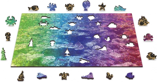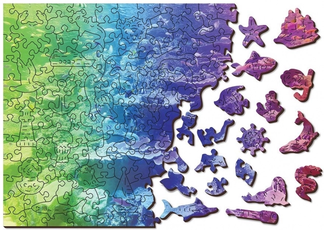 Drevené puzzle Korálový útes 2v1 prináša jedinečný zážitok zo skladania – z jednej strany skladáte podľa farebného motívu, z druhej podľa tvarov s opakujúcim sa vzorom. Časť dielikov má originálne tvary zvierat, predmetov či stavieb a vďaka laserom zvýrazneným detailom pôsobia ako malé samostatné figúrky.