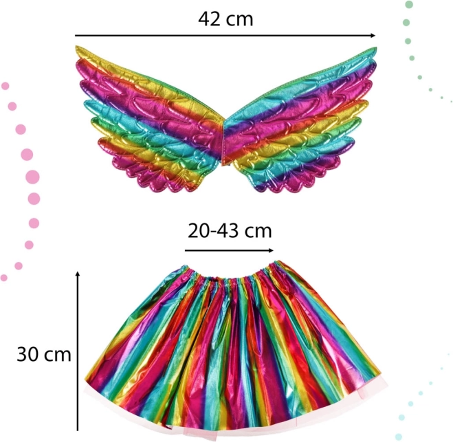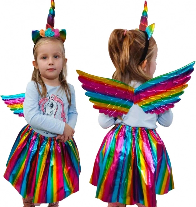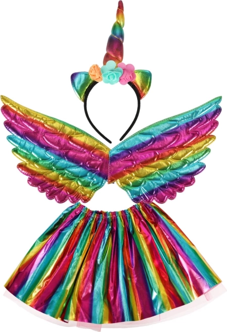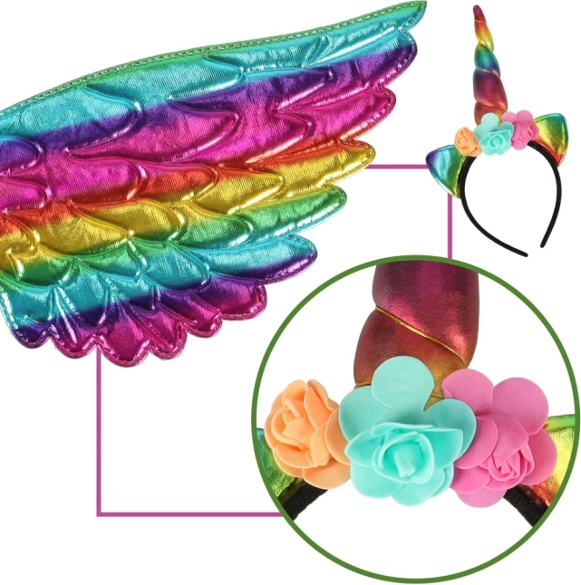 V balení nájdete všetko potrebné - dúhové krídla, čelenku s rohom a sukňu, ideálne pre akékoľvek oslavy.