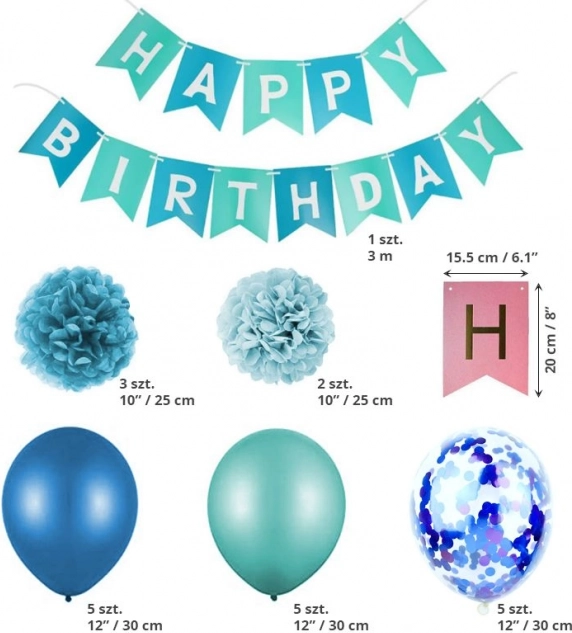 - sada dekorácií sa skladá z balónikov, pom-pomov a girlandy Happy Birthday,