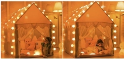 Dodajte detskej izbe rozprávkovú atmosféru. Tento textilný stan v tvare domčeka vytvára útulný kútik na čítanie, oddych aj nekonečné hry. Súčasťou je reťaz 20 LED cotton balls s teplou bielou farbou svetla, ktorý navodí príjemnú náladu. Vstup so závesmi a dve okienka z jemnej sieťoviny zabezpečujú súkromie aj cirkuláciu vzduchu.