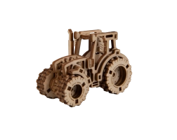 Laserom vyrezané prvky z preglejky vytvárajú realistický vzhľad traktora s ozubením a pneumatikami.