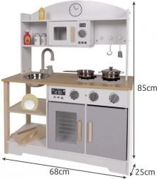• TRVÁCNOSŤ - kuchynka bola vyrobená z kvalitného dreva, čo výrazne ovplyvňuje dĺžku jej používania a bezpečnosť a zdravie tých najmenších. Ide o nadčasový dizajn, ktorý poteší každé dieťa. Vďaka svojmu klasickému vzhľadu bola vždy vysoko cenená. Mimoriadne precízne spracovanie spolu s estetickým prevedením a dôrazom na najmenšie detaily dodáva výrobku pridanú hodnotu a lahodí oku. Kuchynka môže úspešne plniť aj dekoratívnu funkciu a byť ozdobou detskej izby.
