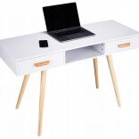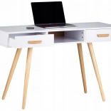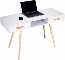 Objavte elegantný a funkčný stôl, ktorý sa skvele hodí do domácej pracovne, spálne aj obývačky. Kombinácia bielej dosky a prírodných borovicových nôh vytvára čistý škandinávsky vzhľad, ktorý ľahko zladíte s moderným aj klasickým interiérom. Vďaka premyslenému úložnému priestoru budete mať všetko po ruke a pracovná plocha zostane prehľadná.