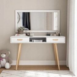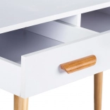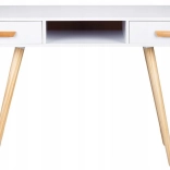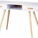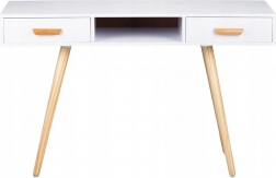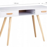 Laminovaná doska je odolná proti poškriabaniu a zafarbeniu, čo oceníte pri každodennom používaní. Masívne borovicové nohy zabezpečujú pevnosť a stabilitu bez neželaného pohybu. Dve priestranné zásuvky a centrálna otvorená nika pojmú kozmetiku, kancelárske potreby aj drobné doplnky.
