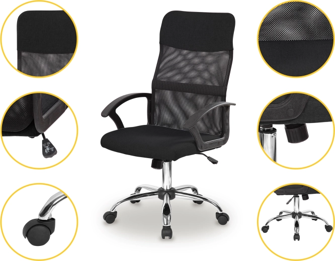 Stolička je vybavená piatimi gumovými kolieskami, ktoré umožňujú ľahký a bezpečný pohyb po akomkoľvek povrchu bez rizika poškodenia. Jej moderný dizajn a elegantná čierna farba znamenajú, že sa perfektne hodí do každého kancelárskeho prostredia.
