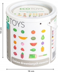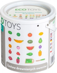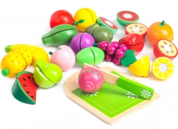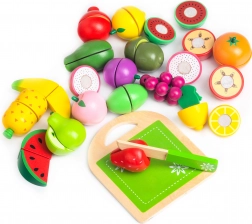 Set dreveného ovocia je vyrobený z ekologického materiálu a pokrytý deťom bezpečnou farbou. Obsahuje drevenú dosku a nôž na krájanie, čo umožňuje deťom simulovať skutočné kuchynské činnosti. Ovocie sa skladá z polovíc spojených suchým zipsom, ktorý poskytuje jemný odpor pri krájaní a vydáva zvuk ako pri krájaní skutočného ovocia.