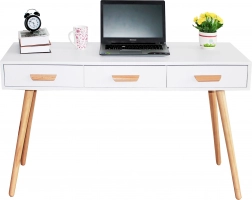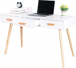 Užite si moderný dizajn tohto stola, ktorý kombinuje bielu vrchnú dosku s prvkami z borovicového dreva. Zaujímavá forma a starostlivé prevedenie zaisťujú atraktívny vzhľad v každom interiéri. Tento stôl môže slúžiť ako kozmetický stolík v spálni, dobre navrhnutý písací stôl v kancelárii alebo konzola v obývačke.