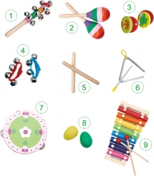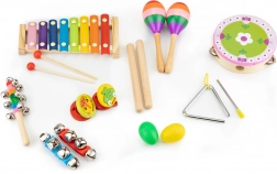 Sada zahŕňa obľúbené perkusné nástroje – od tamburíny a trianglu po maracas a činely – vďaka ktorým dieťa rozvíja koordináciu oko–ruka, sústredenie aj kreativitu. Bezpečné spracovanie bez ostrých hrán a odolné materiály zaručujú dlhú životnosť.