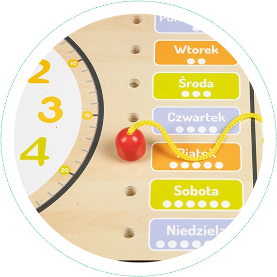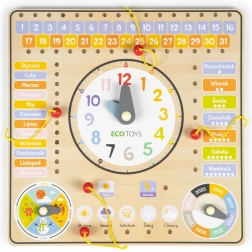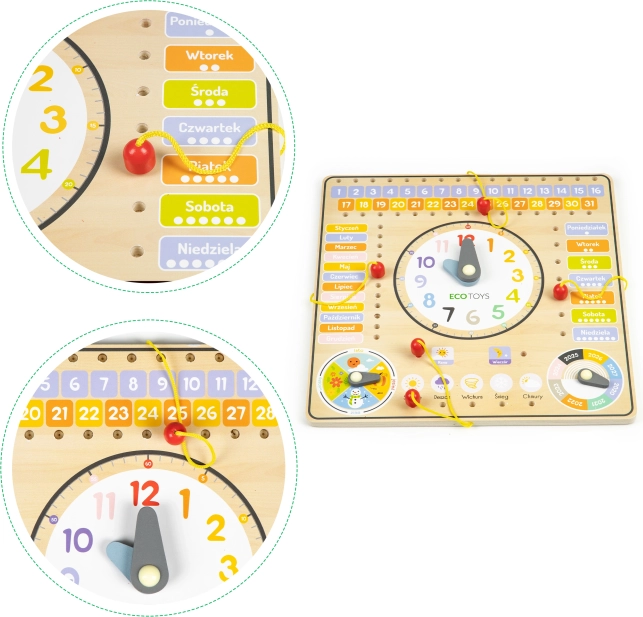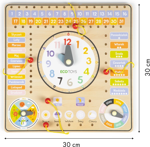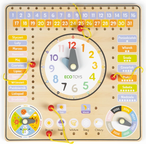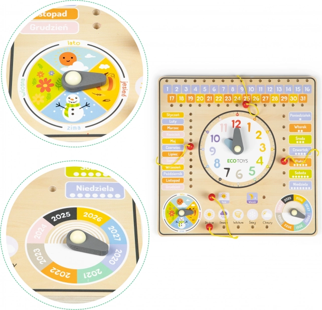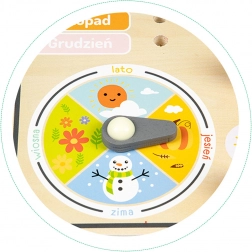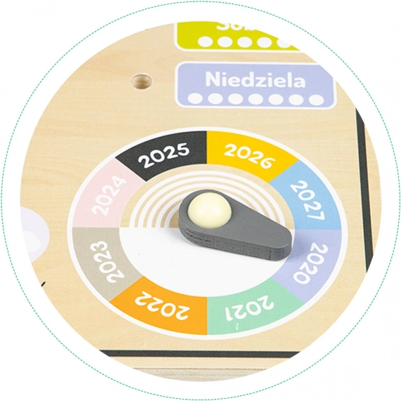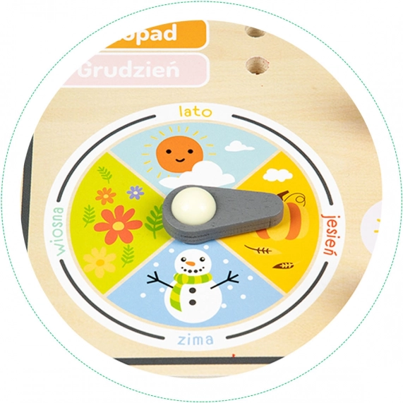 Tabuľa obsahuje poľské názvy, ale je ideálna aj pre slovenské deti vďaka svojej jednoduchej zrozumiteľnosti a odolnej drevenej konštrukcii. Umožňuje deťom lepšie pochopiť rozmanitosť ročných období pomocou rotačného ukazovateľa. Na tabuli je aj možnosť označiť rok v rozmedzí 2020-2027.
