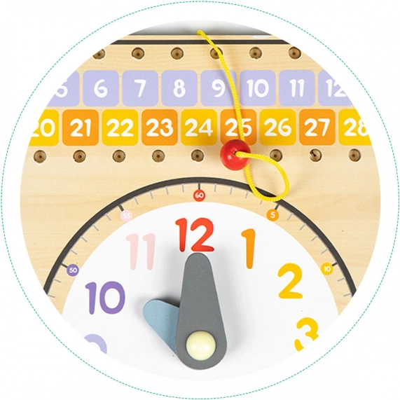 Umožnite svojim deťom objavovať svet s touto farebnou a bezpečnou drevenou tabuľou. Učí deti rozpoznávať dni v týždni, poradie dní a mesačných období. Pomocou špeciálnych políčok môžu deti označovať dni v kalendári pomocou šnúrky a dreveného kolíčka.