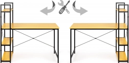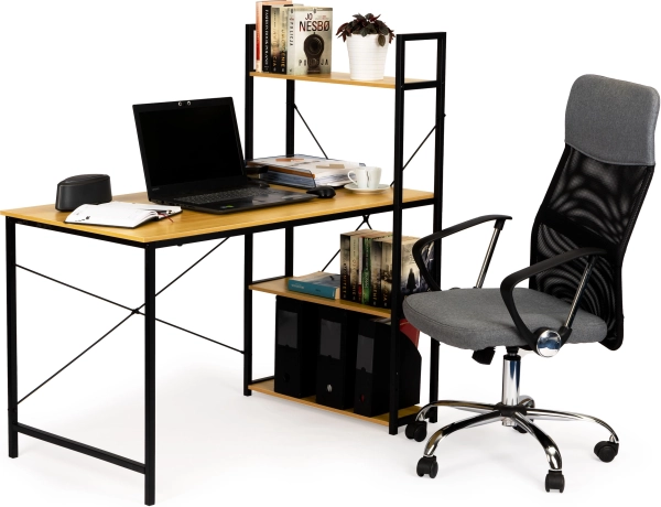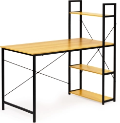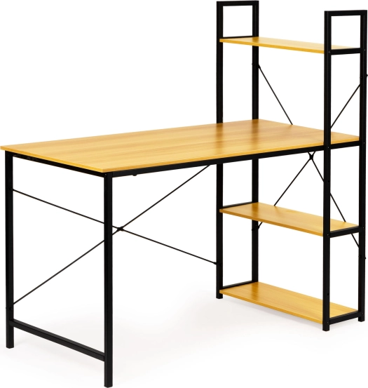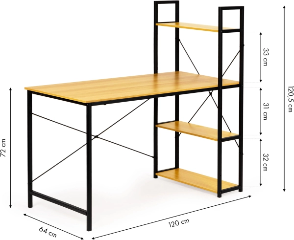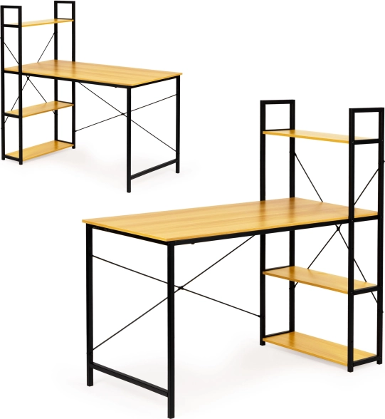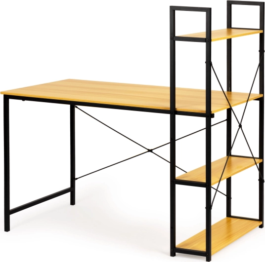 Stôl ponúka priestrannú pracovnú plochu a bočný stojan so štyrmi policami na uskladnenie kníh, dokumentov alebo dekorácií. Celá konštrukcia je navrhnutá s ohľadom na odolnosť a dlhú životnosť, vďaka použitiu materiálov ako MDF doska a práškovo lakovaná oceľ.