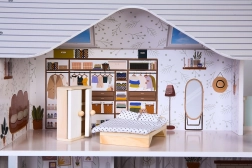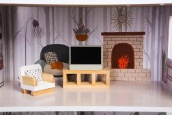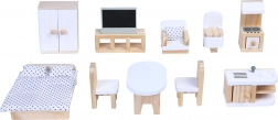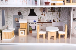 Sada obsahuje farebné drevené prvky ako skriňa, TV stolík, kreslo, toaletu, sporák, posteľ, stôl a dve stoličky, kuchynskú linku a ďalšie komponenty, ktoré premieňajú domček na reálny domov v mierke.