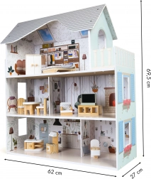 Domček má tri samostatné úrovne a celkovo štyri miestnosti, ktoré sú štýlovo zariadené podľa svojho určenia. Súčasťou balenia je 10 kusov dreveného nábytku a rôzne doplnky ako vysávač, gitara, zrkadlo alebo psia búda. Každý prvok je možné voľne presúvať a upravovať podľa potreby.