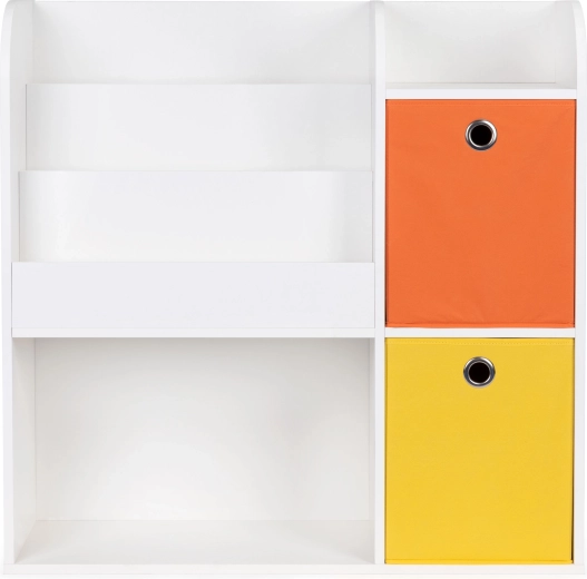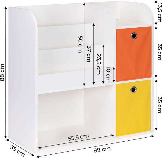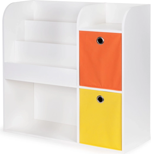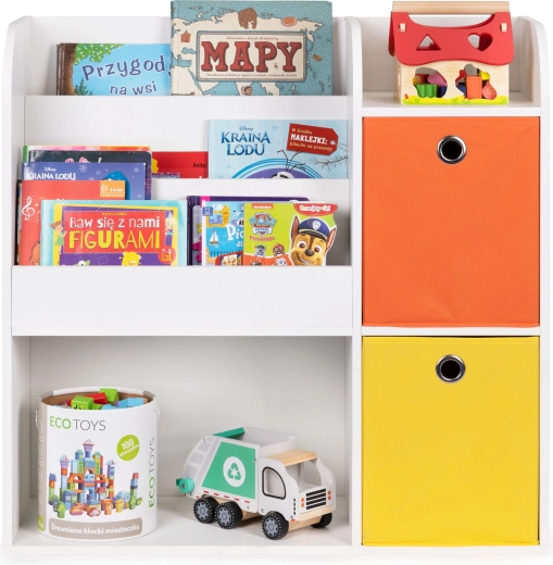 Nábytok je vyrobený z odolnej drevotrieskovej dosky a povrchovo upravený dyhou odolnou proti poškodeniu. Hlboké priehradky pojmú vaše obľúbené knihy, albumy, omaľovánky a časopisy a police budú ideálne na uloženie hračiek. Súčasťou sady sú navyše 2 priestranné textilné koše, ideálne na kocky a ďalšie doplnky.