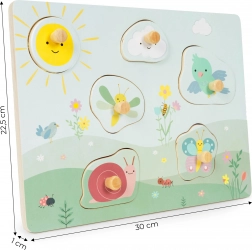 Farebné dieliky s prírodnými motívmi deti lákajú k priraďovaniu do správnych okienok. Precvičujú rozpoznávanie tvarov a farieb a zároveň rozvíjajú jemnú motoriku vďaka pohodlným dreveným úchytkám.