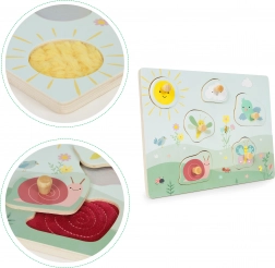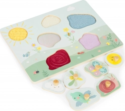 Táto zmyslová vkladačka podporuje prirodzenú zvedavosť detí: pri vkladaní dielikov deti skúmajú rôzne farby, tvary a štruktúry, čím si posilňujú jemnú motoriku, koordináciu oko–ruka a kognitívne zručnosti. Každý dielik má drevenú úchytku na pohodlné uchopenie aj malými prštekmi.
