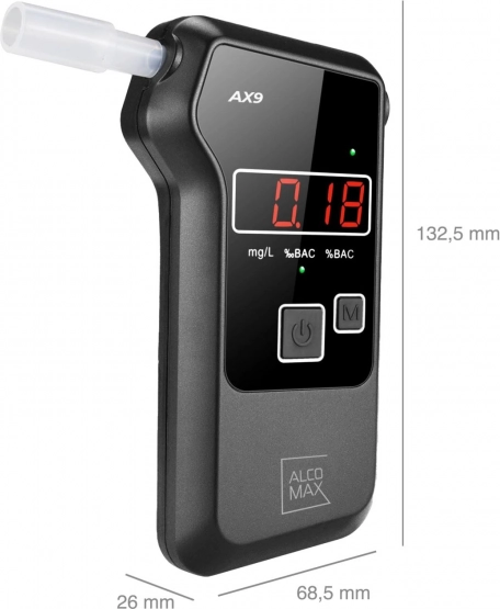 Tento alkohol tester AlcoMax AX9 je ideálny pre individuálne použitie. Vďaka pokročilému elektrochemickému senzoru, ktorý využíva reakcie platiny s etanolovými časticami, poskytuje vysokú presnosť merania v rozsahu od 0 do 2‰. Výsledok je prezentovaný na prehľadnom LED displeji.