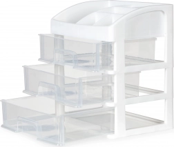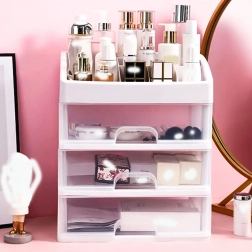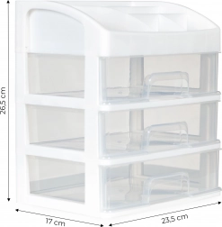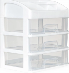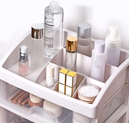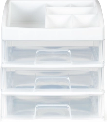 Udržujte svoju kozmetiku organizovanú a prehľadnú s naším elegantným bielym plastovým organizérom. Jeho praktická konštrukcia ponúka niekoľko priehradok a tri priehľadné zásuvky, v ktorých možno ľahko uskladniť akékoľvek drobnosti.