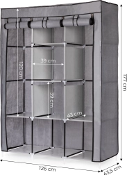 Táto veľká textilná skriňa je skvelou voľbou do spálne, šatníka aj predsiene. Kombinuje závesný priestor na košele, šaty a kabáty s policami na svetre, krabice či topánky. Jednoduchý, univerzálny dizajn ľahko zapadne do každého interiéru a poskytne množstvo úložného miesta aj v menších miestnostiach.